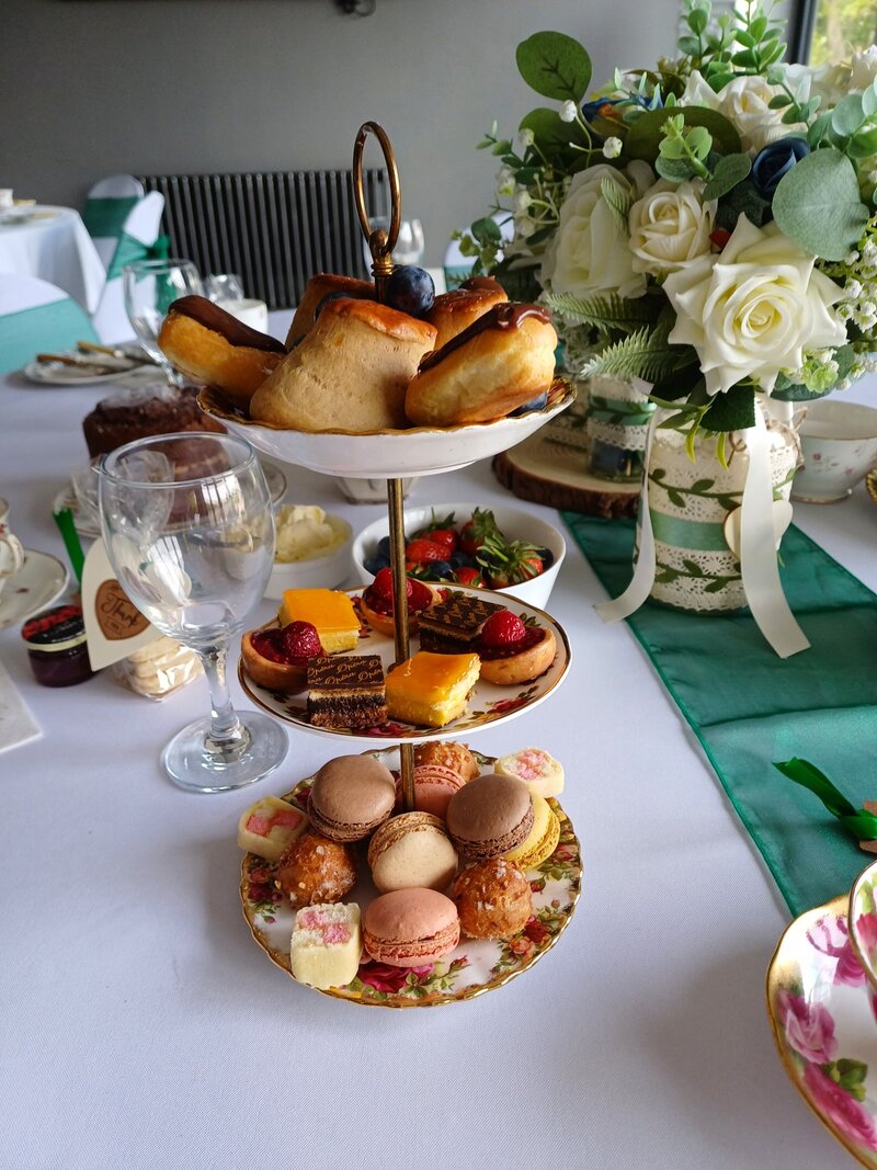 Scones with cream strawberries jam and tartlets. Lemon drizzle pastries, shortbread cake bites. Classic eclairs, scones, Macarons, tarts., mini cakes, petit fours, mini desserts in cups.